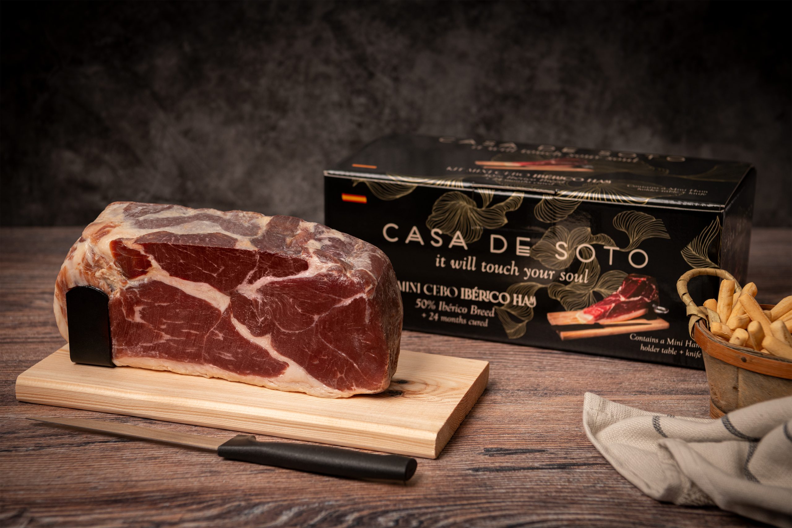 Un producto innovador, perfecto para cpmpartir o regalar, con calidad en cada corte. Un Mini Jamón Casa de Soto para ocasiones especiales acompañado de una tabla y un cuchillo